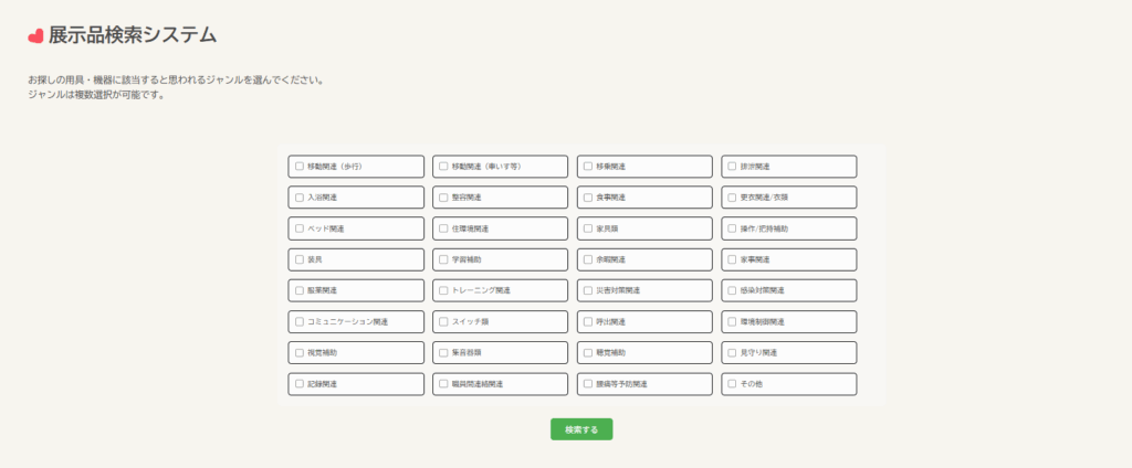 事業所やご自宅から、展示場にある車いすやベッド、自助具などの情報を検索していただけます。